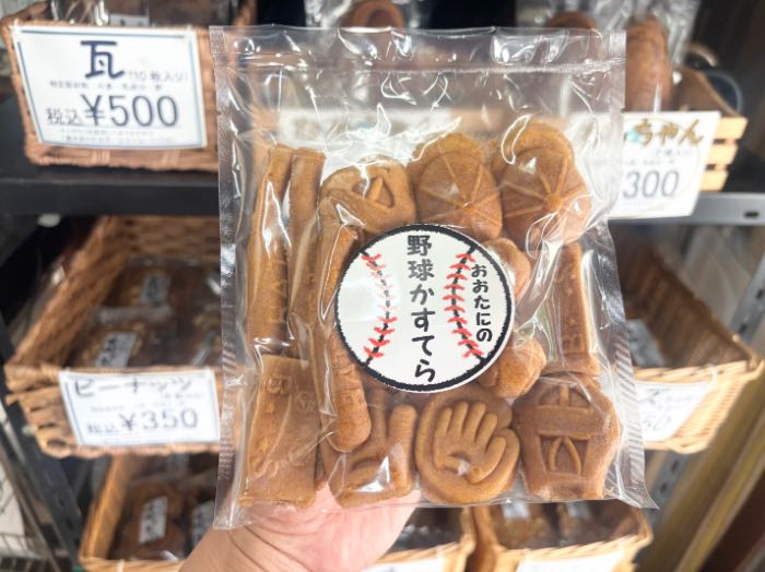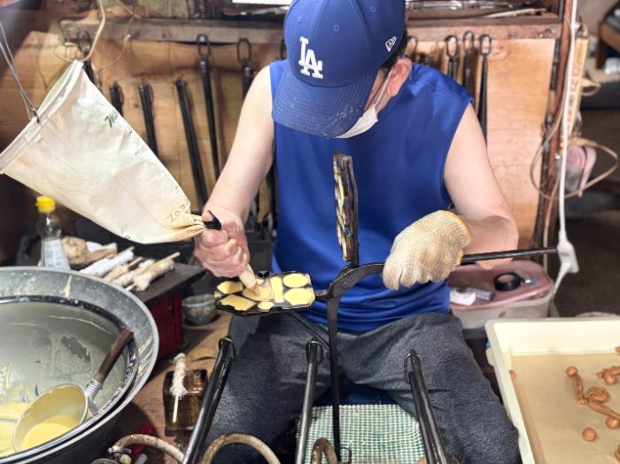 お煎餅や野球カステラは、一枚一枚、ひとつひとつ手焼きにて焼かれております。生地からこだわりその日の気温や湿度などを見極め、絶妙な加減で生地や焼き加減を調整されています。まさに職人技。運が良ければ焼いている光景を見学できるかもしれません。