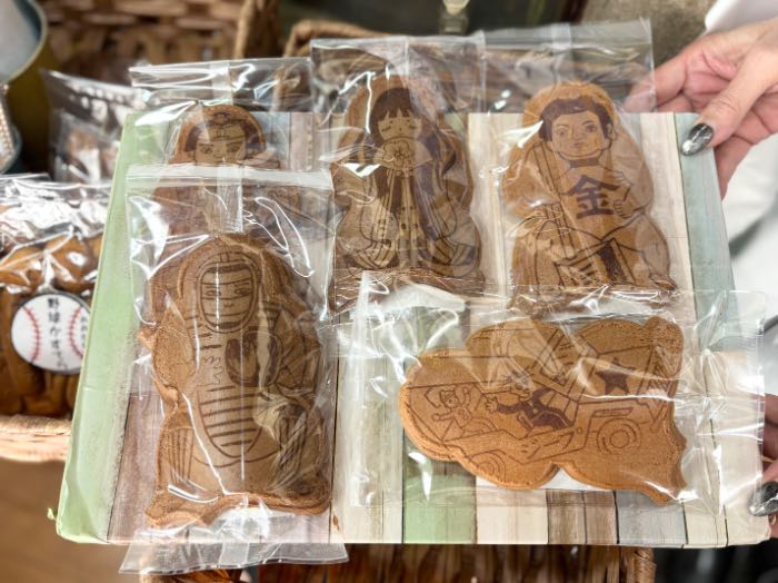 お煎餅の人気シリーズ人形焼きお煎餅、手のひらほどのビッグサイズのお煎餅はどちらも違った表情をしており、とってもユニークで個性的、クールな眼差しのキャッチャー君や令和生まれの姫ちゃんなど表情豊かなお煎餅も!!