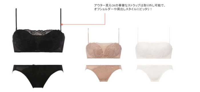 「Daily Plus」第一弾の注目は、花柄レースを使用したストラップレスブラ。華奢なストラップは取り外し可能で、アウターのデザインに合わせた着こなしが可能です。