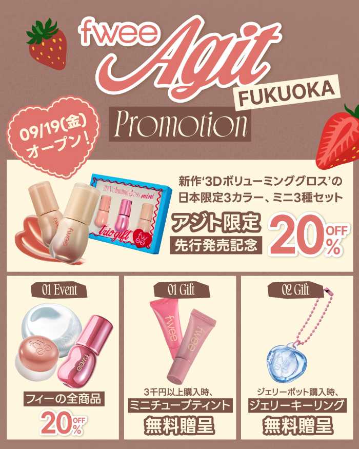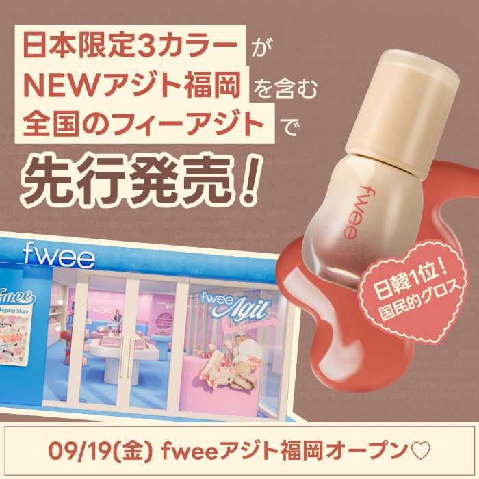 韓国発トレンドコスメブランド「fwee(フィー)」が、日本で4番目となる旗艦店「フィーアジト福岡」を2025年9月19日(金)にオープン。オープンを記念して、日本限定3色が仲間入りする「3Dボリューミンググロス」と、完売必至の人気色を集めた「ミニトリオギフト」が先行発売されます。さらに期間限定の特典も盛りだくさん♡注目の新作&キャンペーン内容をご紹介します。