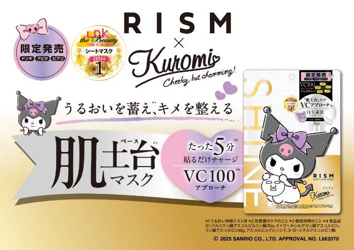 マルチタスクで忙しい毎日でも、手軽に肌ケアを楽しめるRISMの『BASE』シリーズから、サンリオ人気キャラクター・クロミとコラボした「デイリーケアマスク シャイン」が登場!2025年9月16日(火)よりドン・キホーテ系列店舗限定で数量限定発売。100%植物セルロース素材に美容成分をたっぷり浸透させたオールインワン設計で、5分でハリ・ツヤのある白玉※1肌へ♡