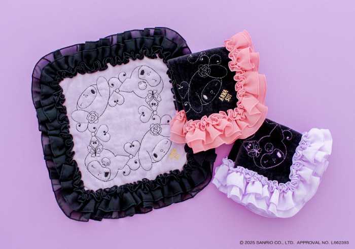 タオルハンカチは3タイプ展開で、ふんわり柔らか素材やフリル付きの豪華なデザイン(¥1,100〜¥2,750)まで、コラボならではのアップリケ刺繍やラメ糸を贅沢に使用しています。