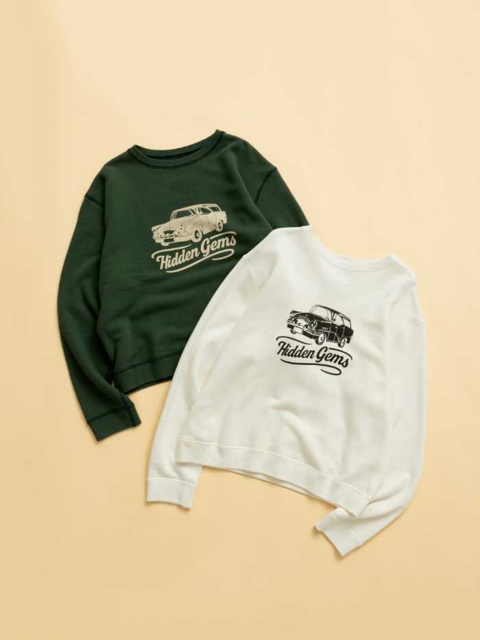 「Vintage Print Sweat」(42,900円税込)や「Vintage Car Print Sweat」(34,100円税込)は、風合いとディテールにこだわったアイテム。