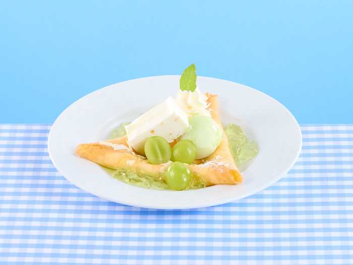 クレープにジェラートやカッサータを重ね、ゼリーを添えた爽やかな一皿。