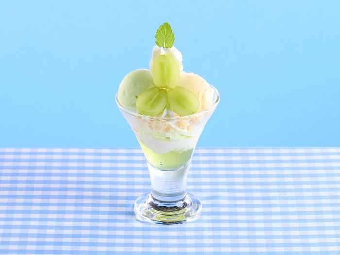 上品な甘さのシャインマスカットやマスカットジェラート、爽やかなカッサータ、パンナコッタを重ねた贅沢なパフェ。