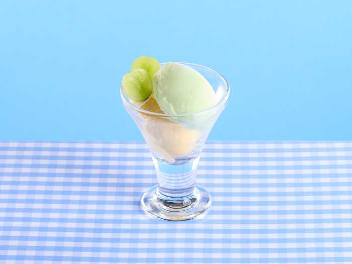 爽やかなジェラートとやさしい甘さのアイスにシャインマスカットを添えたシンプルなデザート。