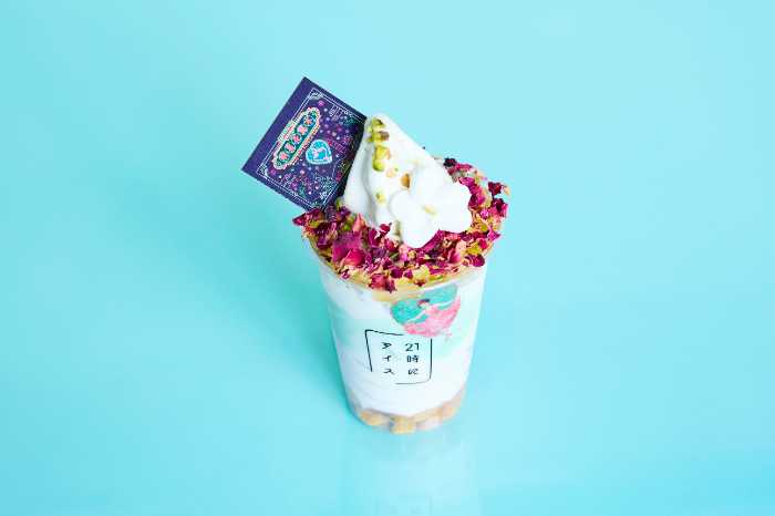 「明星花露水×21時にアイス」の特別なコラボアイス(850円・税込)は、ソフトクリームにジャスミンゼリーやローズ、爽やかなミントパンナコッタを重ねた香り高いパフェ。