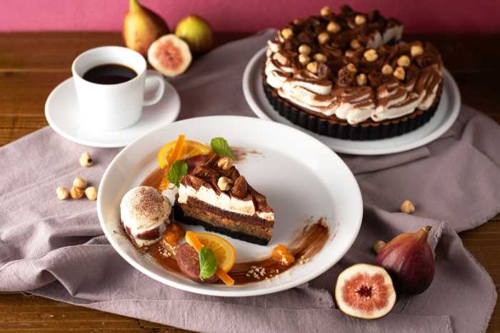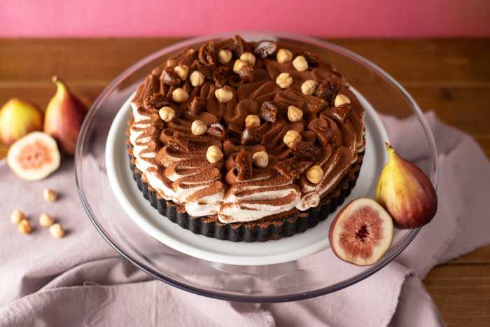 コーヒーシロップをしみ込ませたココアタルトの上に、ふんわり香るティラミスクリームを重ね、仕上げにはドライいちじくとヘーゼルナッツをトッピング。