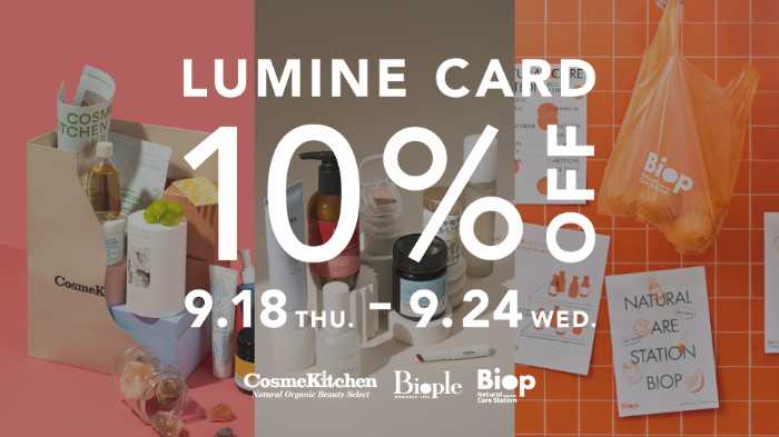 2025年9月18日(木)~9月24日(水)の期間、ルミネカード10%OFFキャンペーンが開催されます。Cosme Kitchen(コスメキッチン)、Biople(ビープル)、Biop(ビオップ)では、この期間だけのお得な限定キットや人気アイテムの再販、豪華なノベルティが多数登場。ナチュラル&オーガニック派の方にぴったりの充実ラインナップで、秋のショッピングをもっと楽しめる一週間になりそうです♪