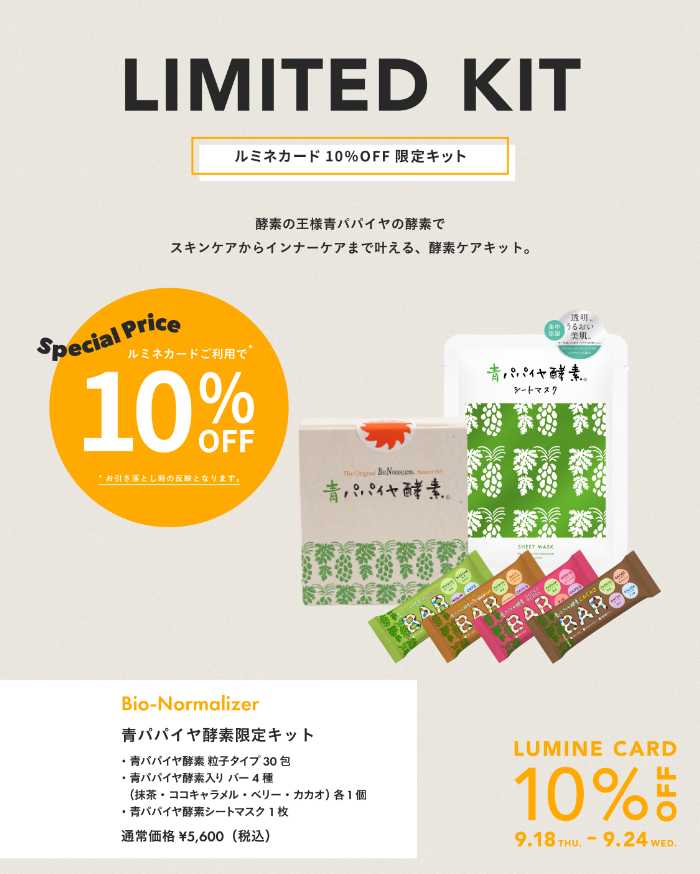 青パパイヤ酵素を贅沢に楽しめる「青パパイヤ酵素限定キット」(5,600円税込)は、粒タイプからシートマスク、酵素入りスイーツまでが揃ったスペシャルセット。