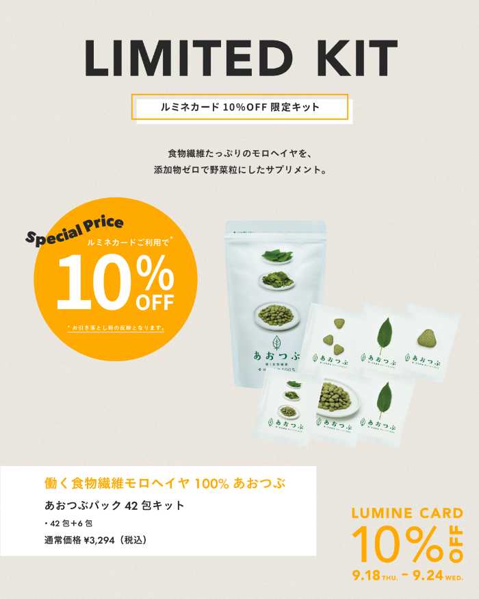 モロヘイヤ由来の「働く食物繊維モロヘイヤ100%あおつぶ」42包+6包入りは3,294円(税込)で登場。