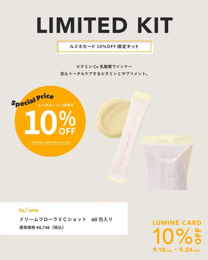 さらにto/oneからは、ビタミンCと乳酸菌を組み合わせた「ドリームフローラVCショット」大容量60包入り(8,748円税込)もラインアップ。