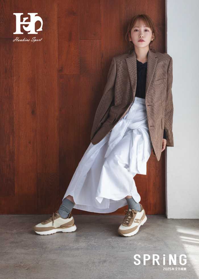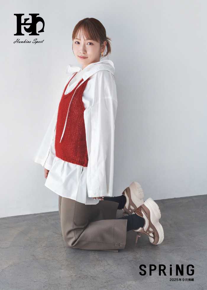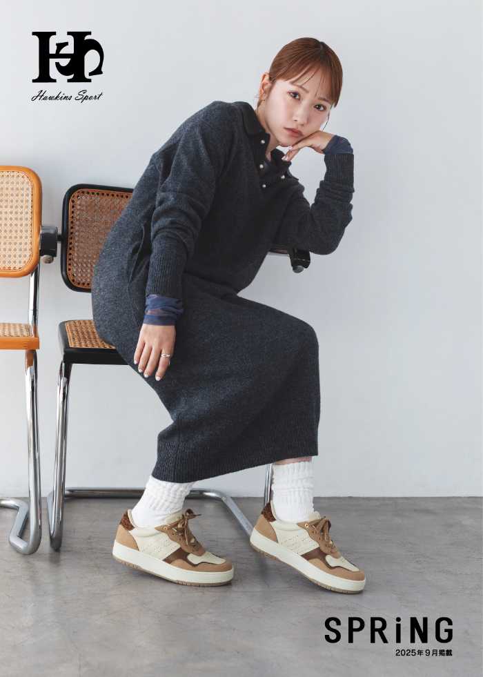 川栄李奈さんが着こなすHawkinsの新作ブラウンスニーカーは、落ち着いた大人のスタイルにぴったり。