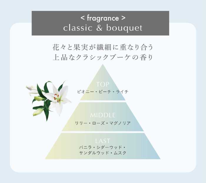 花々と果実が重なる穏やかな香りがバスルームにふんわり広がり、洗髪のたびにリラックスタイムを演出します。