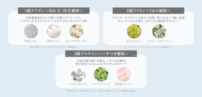 プロミルホームケアシャンプー/トリートメントには、羊毛・羽毛・カシミヤヤギ由来の加水分解ケラチン*1を配合。髪の内部までアプローチし、ダメージによる切れ毛や枝毛を補修します。