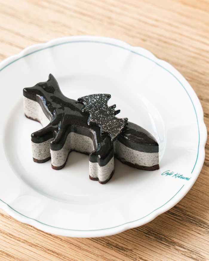 定番人気のキツネ型ケーキが黒ごま仕立てになった「キツネケーキ セサミ」(青山・大阪・福岡、¥750)は、黒ごまブリュレとムースにザクザク食感を重ねた濃厚な味わい。