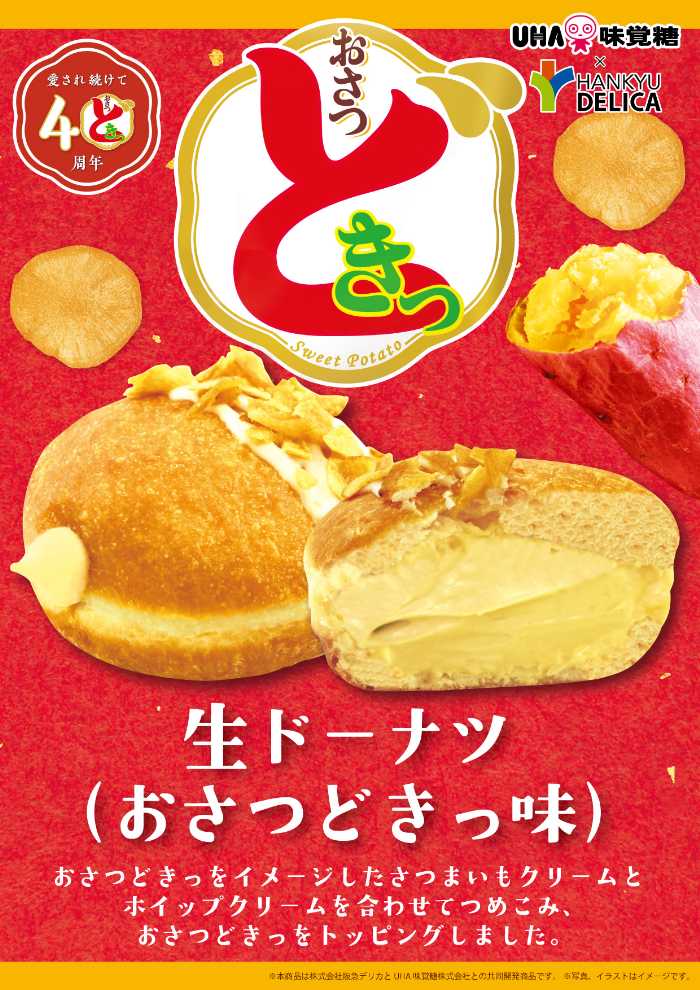 「生ドーナツ(おさつどきっ味)」は、ふわふわの生地にさつまいもクリームとホイップクリームを贅沢にサンドし、さらに「おさつどきっ」をトッピング。