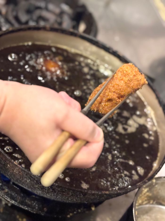 鍋で丁寧に揚げている極太のとんかつ