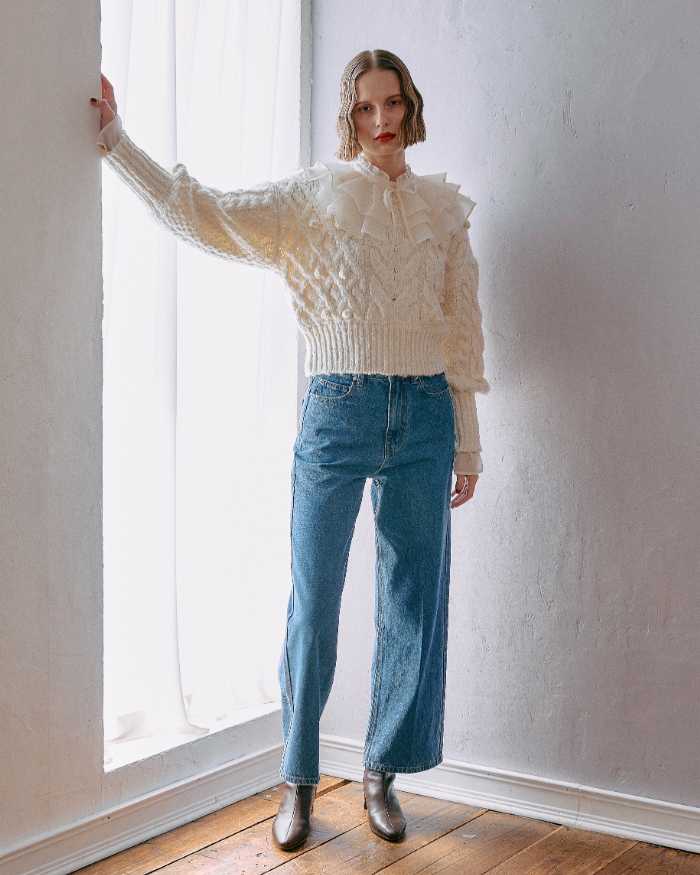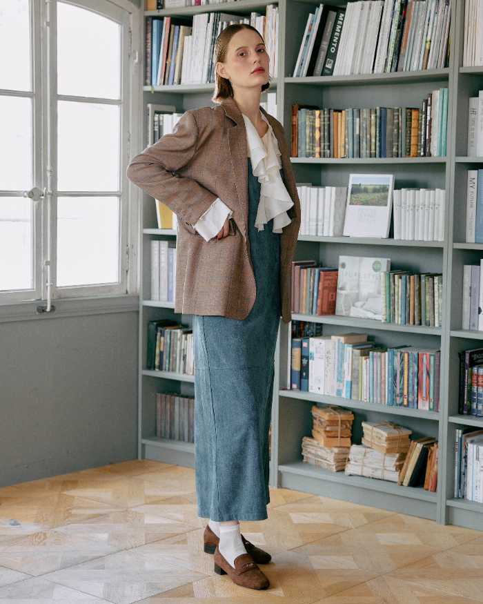 2025年秋冬ビジュアルでは、フェミニンなフリルブラウス×デニムのカジュアルコーデから、スエードキャミワンピ×チェックジャケットのクラシカルスタイルまで多彩な全8コーデを提案。