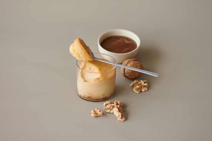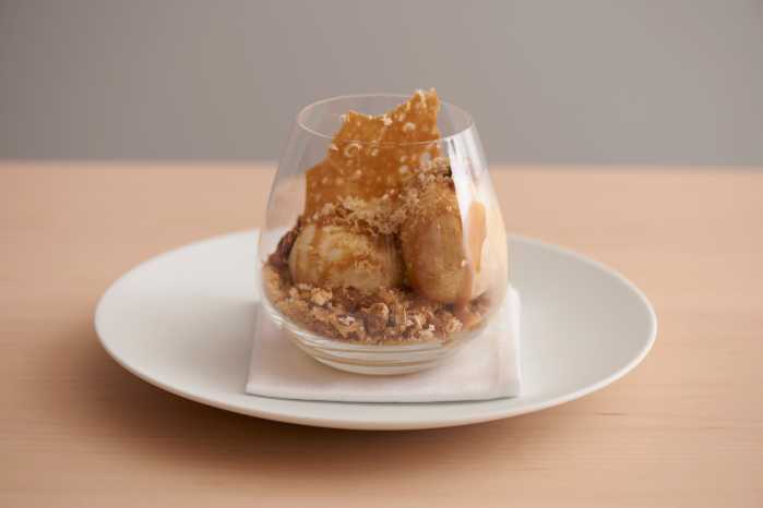 香ばしいほうじ茶のクレームブリュレに、バニラとキャラメルのアイスクリーム、砕いたガレットブルトンヌを重ね、クルミの食感をプラス。