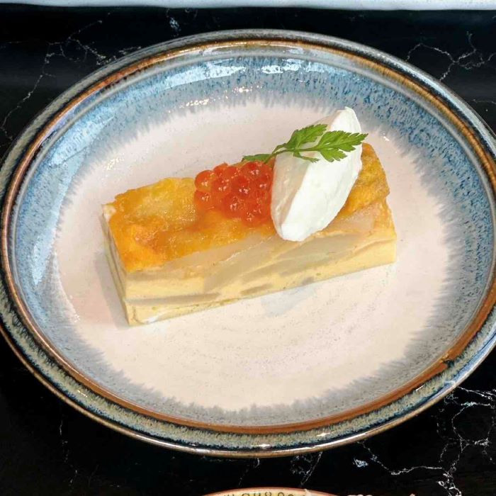 WABISUKE卵で仕上げたスパニッシュオムレツの中には、濃厚な甘みをもつじゃがいもがたっぷり。上にはなめらかなクリームと、ほんのりスモークをかけたいくらを添え、奥行きのある味わいに!