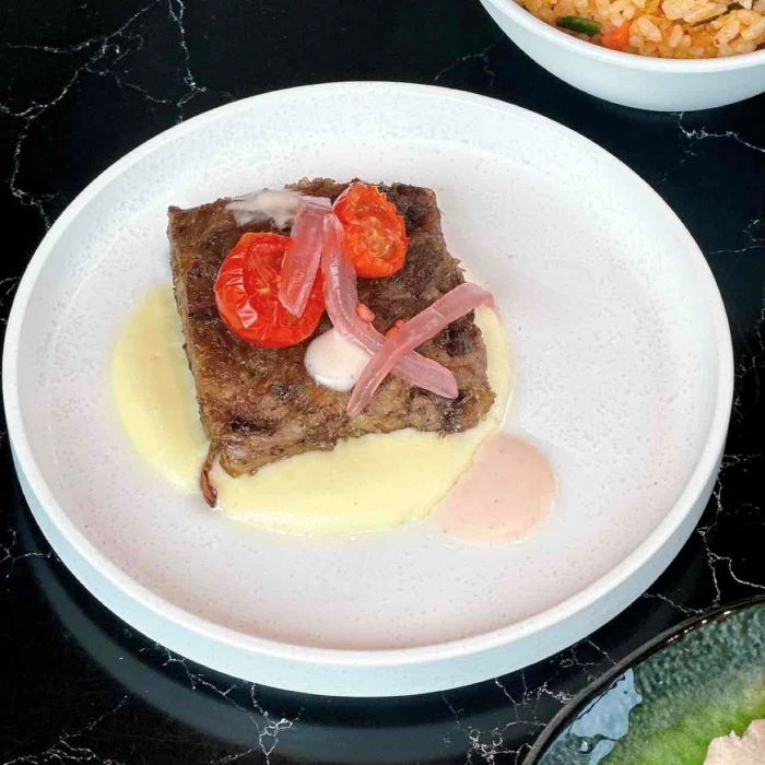 骨を抜いてプレスしたショートリブは、外側は香ばしくカリッと、中はやわらかく仕上げられており、食感のコントラストと旨みが際立ちます。香ばしさとやわらかさが際立ち、とても美味しいです。