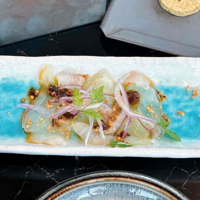 《真鯛のクルード、パッションフルーツ、チリオイル、クリスピーキヌア》