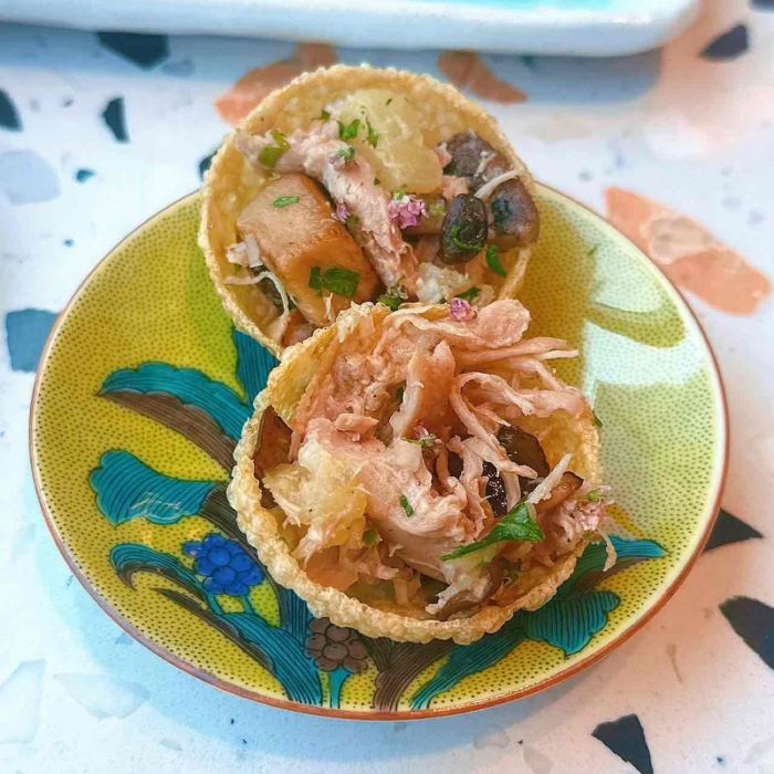 たこ焼きをイメージした遊び心あふれる一皿。パリッとしたパニプリの食感に、ダックコンフィの旨みと洋ナシの甘さ、マッシュルームマーマレードの香りが重なり、ほんのり甘めに仕上がっています。器に見立てた丸い生地は、ひよこ豆で作られています。