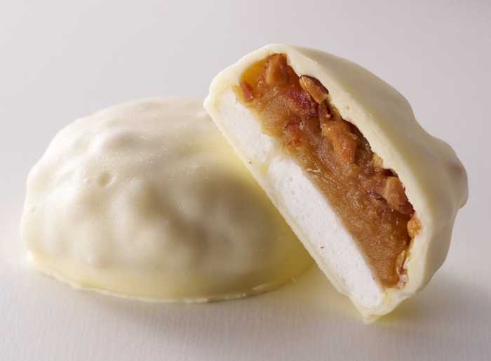 軽やかなマシュマロの上に芋あんをのせ、ホワイトチョコで包み、さらにキャンディングアーモンドをトッピング。かりっ、ふわっ、とろっの3つの食感が一度に味わえる、新しい北海道スイーツに仕上がっています。