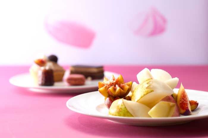 秋の果実をふんだんに使ったカットフルーツが食べ放題♡スタンドには、モンブランタルトやプチカヌレ、オペラ、マカロン、アップルパイなど洋菓子が並び、まるでパティスリーを楽しむ気分に。