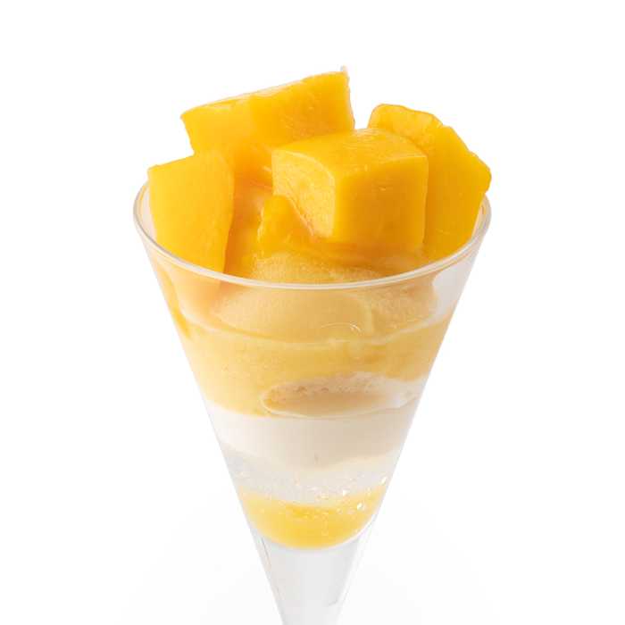 自家製マンゴーシャーベットのミニパフェは平日3:00pmより提供。マンゴーの香りとオレンジソース、コアントローゼリー、ディプロマットクリームが重なり、贅沢な味わい♡
