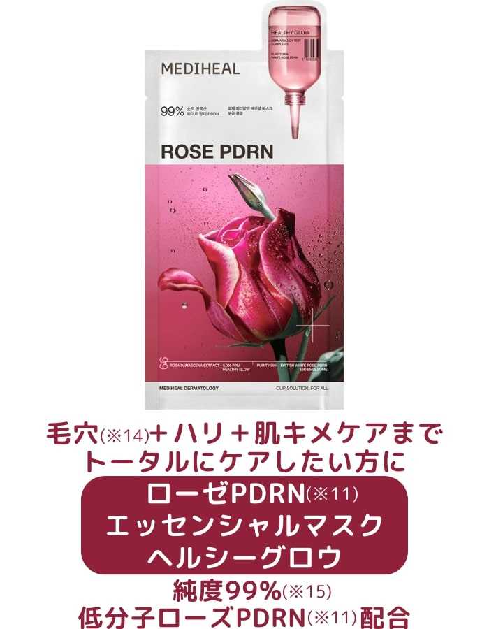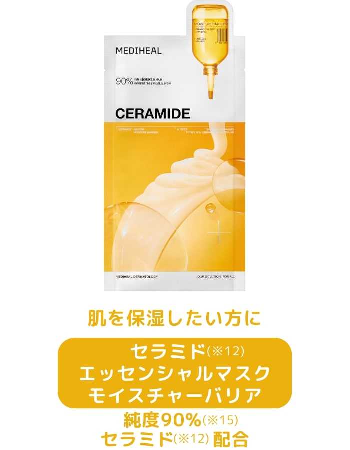 (※1)メディヒールマスクパック累計販売数量(2009-2025)(※2)目安の使用時間のこと(※3)乾燥による(※4)2025年3月集計結果:2011年~2024年 韓国オリーブヤングマスクパックカテゴリー売上1位(※5)店頭開始日となり、購入可能日は各店舗により異なります。(※6)一部店舗を除きます。(※7)4-テルピネオール(整肌成分)(※8)マデカッソシド(整肌成分)(※9)アスコルビン酸(製品の抗酸化剤)(※10)加水分解エクステンシン(保湿成分)(※11)原料の一部にイギリス産ホワイトローズ(ダマスクバラエキス:保湿成分)を使用(※12)セラミドNP、セラミドAP、セラミドEOP、セラミドNS(すべて保湿成分) (※13)ヒアルロン酸Na(保湿成分)(※14)乾燥により毛穴が目立つ肌状態のこと(※15)純度の数値は配合成分に関する参考値であり、製品の効果を保証するものではありません。(※16)肌の油分と水分を補い保つこと(※17)うるおいによりつややかで明るい肌印象のこと (※18)角質層まで(※19)クリ殻エキス,イチジク果実,ハマメリス葉水,グルコノラクトン,ダマスクバラエキス,カノラ油,ヒマワリ種子油,メドウフォーム種子油,アルガニアスピノサ核油(全て保湿成分)(※20)保湿成分(※21)パンテノール,スクワラン,グルコノラクトン(全て保湿成分)(※22) ツボクサ葉エキス,ツボクサ根エキス,ツボクサ油,マデカシン酸,アシアチン酸,アシアチコシド,ツボクサ葉水,ツボクサカルスエキス,ツボクサ葉/茎エキス,マデカッソシド(全て整肌成分)