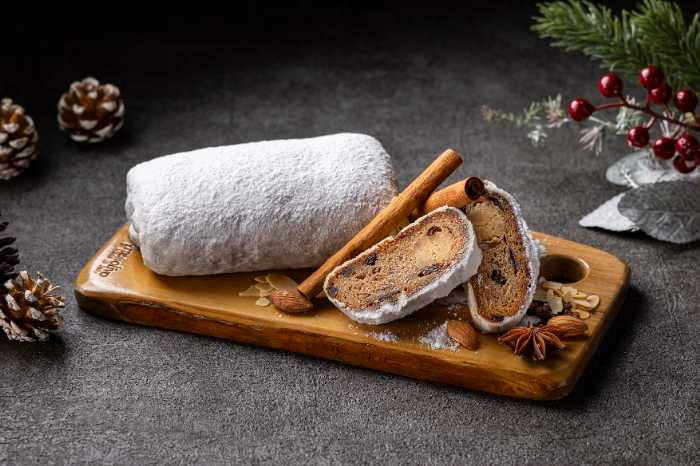 クリスマスに欠かせないシュトーレンは3種(各3,456円)。ラム酒漬けドライフルーツたっぷりの定番、栗やあんこを包み込んだ抹茶、チョコレートとブランデー香る大人な味わい。