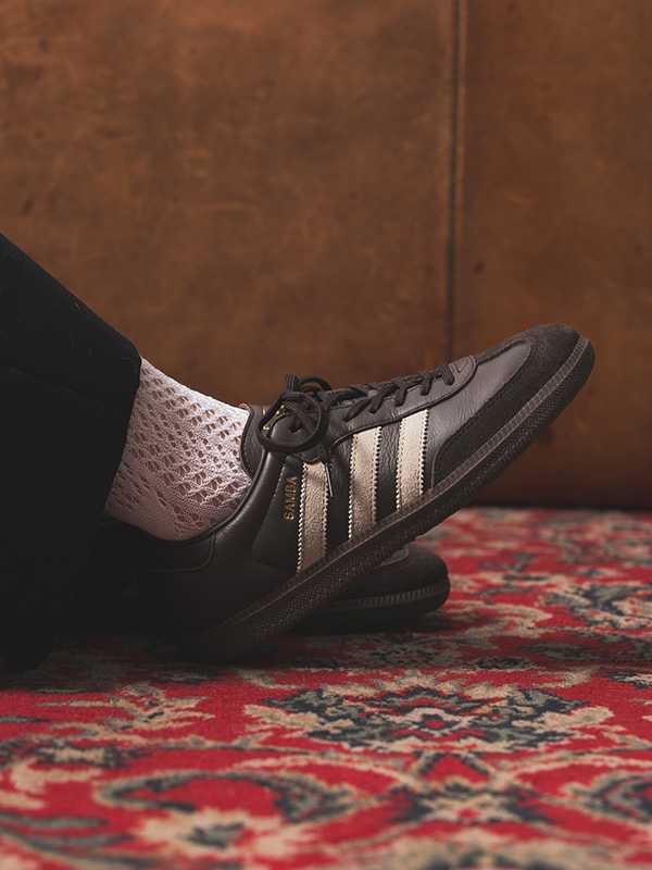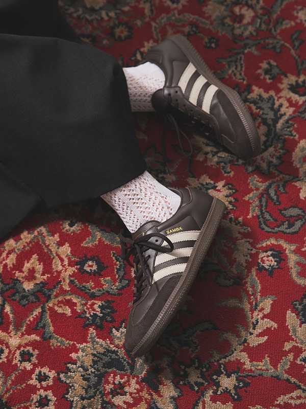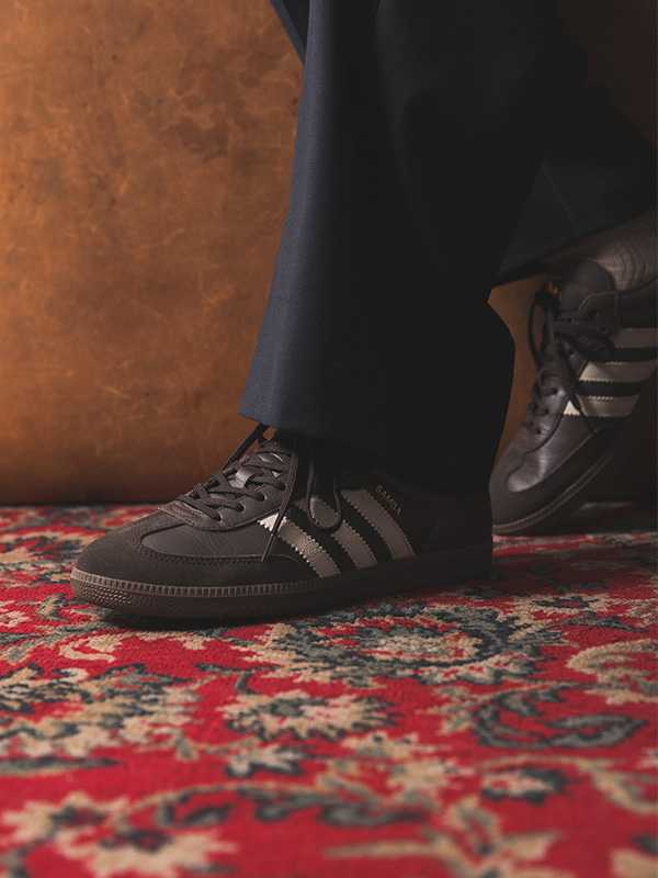 サイドのスリーストライプスにはグレーのスエード、シュータンのトレフォイルロゴや「SAMBA」のレタリングにはゴールドを採用し、さりげなくファッショナブルな印象をプラスしています。