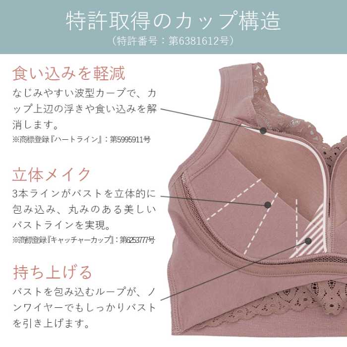 「Sweet Night Bra」は、メッシュテープを使った特許取得のオリジナルパターン(特許番号:第5185887号)を採用。バストの大きさに合わせて伸縮する仕組みで、しっかりフィットしながら通気性も確保。