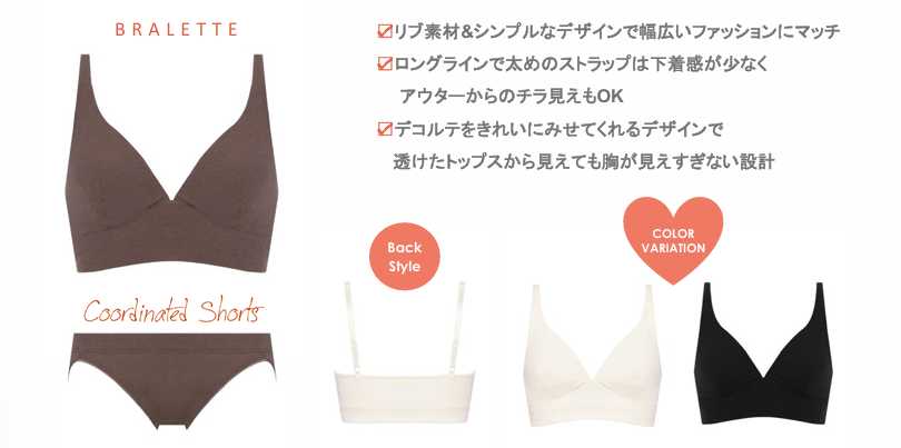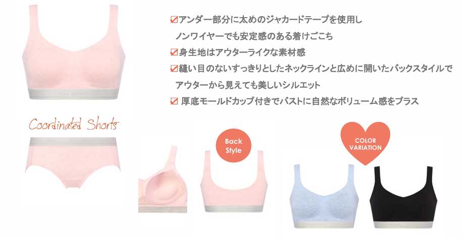 ノンワイヤーでラクちんな着けごこちを実現しつつ、ストラップや丈感にこだわり、下着感を抑えたデザインです。
