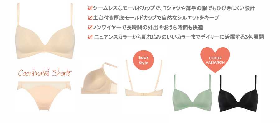 シンプルながら機能性も抜群のノンワイヤーブラ。モールドカップ仕様でTシャツや薄手の服にもひびきにくく、自然に胸を整えます。
