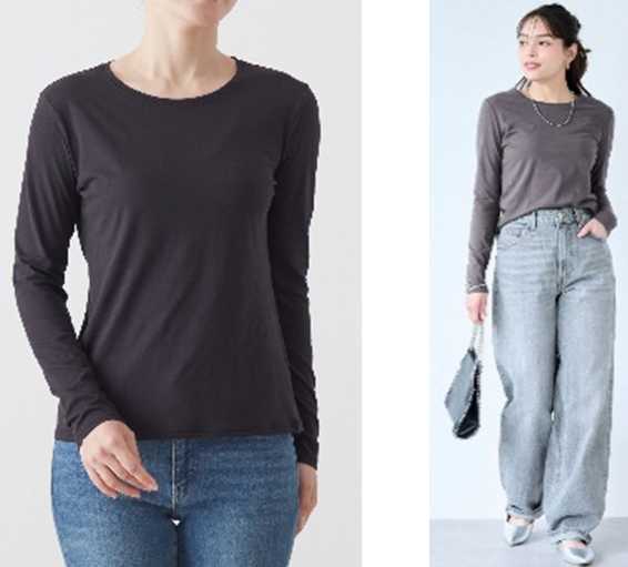 「シルク混ホットコット」は、綿45%・レーヨン40%・シルク15%を使用したなめらかな素材感が魅力。微光沢があり、一枚でも着られる上品さを備えています。