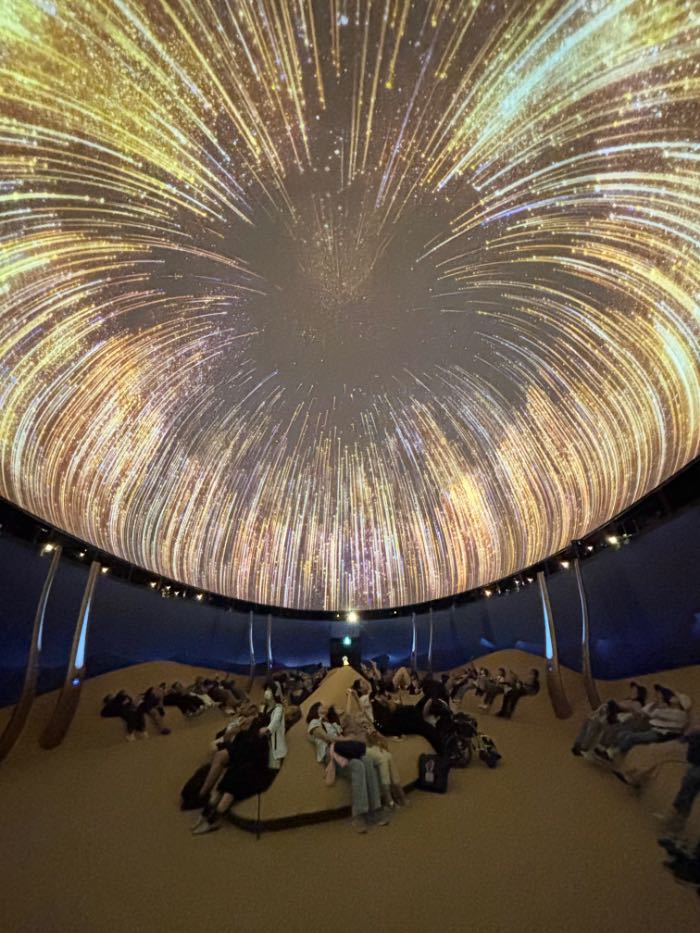 パビリオンのフィナーレは、迫力のドームシアター。頭上いっぱいに広がる映像に包まれ、未来への希望を描く物語が展開します。テクノロジーを駆使した演出は、まるでプラネタリウムのようにキラキラとした世界を体験させてくれます。