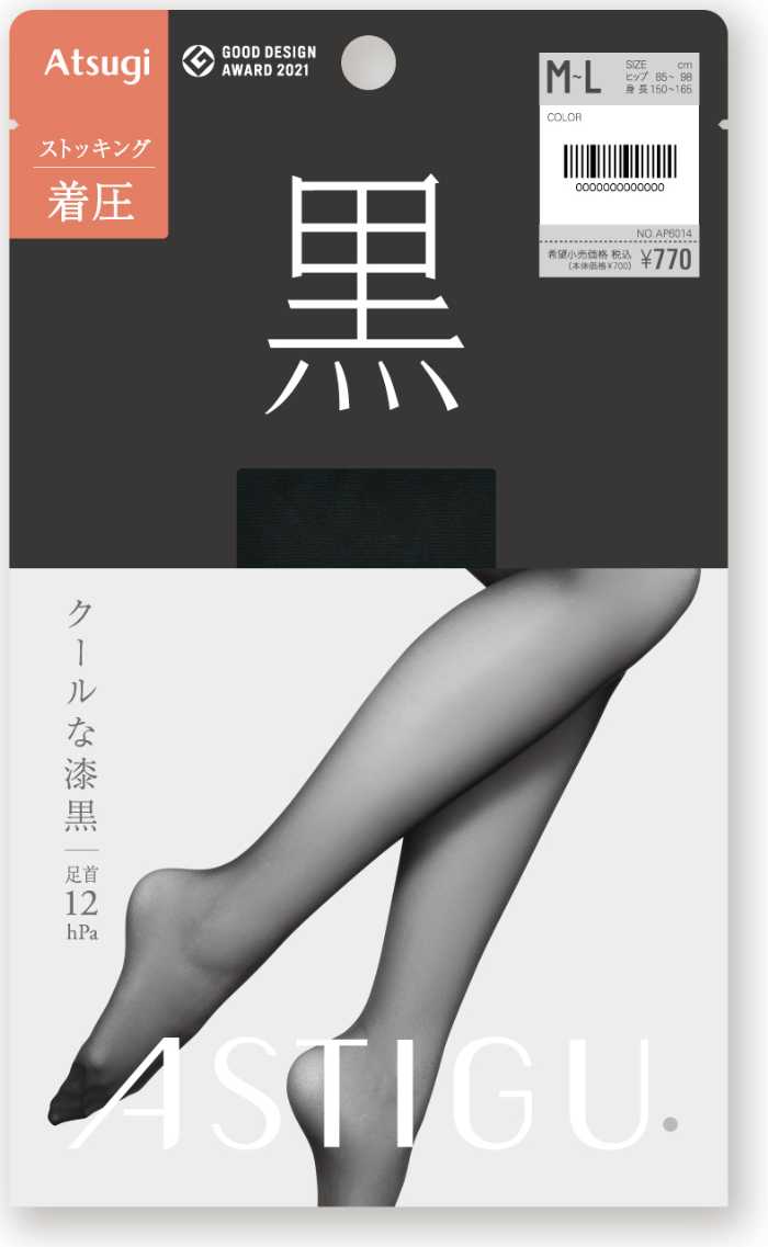 アスティーグ【黒】着圧タイプは、美しい漆黒と程よい引き締め感で、脚をすっきりと魅せる心強いアイテム。