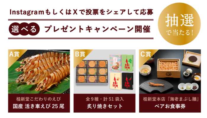 A賞の「国産活き車えび25尾」や、B賞の炙り焼きセット(9種・51袋入)、C賞の「海老まぶし膳」ペアお食事券など、どれも魅力的な賞品。