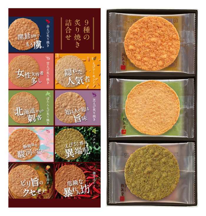 「9袋入1,080円(税込)」で、赤えび炙り焼きから激辛カレーまで、一度に9種類を食べ比べできるチャンスです。これを食べれば、あなたの“推し”炙り焼きが決まること間違いなし!