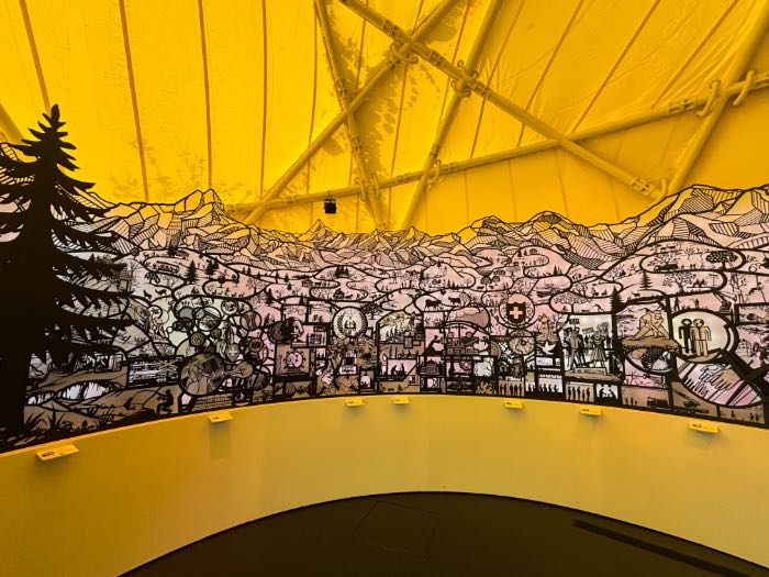 パビリオンに入ると壁一面に広がるのは、美しい切り絵、こちらの切り絵には、豊かな自然とスイスの情勢やハイジの姿が描かれています。隠れハイジがたくさんいるので、宝探しのような気持ちで拝見できます。