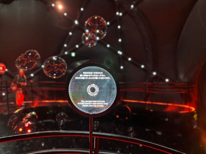 2番目の展示室は薄暗い空間にシャボン玉がふわふわと浮かび、幻想的な雰囲気に包まれています。設置されたパネルに願いを込めて声を発すると、その願いがシャボン玉となって空へ舞い上がる仕掛けです。