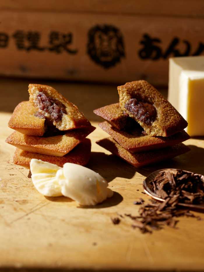 看板商品「あんバタフィナンシェ」は、北海道千歳産「えりも小豆」を使った餡子と、焦がしバター香るフィナンシェ生地が織りなす和洋折衷の逸品。
