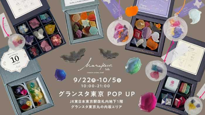 職人が丁寧に切り出す、まるで鉱物のような琥珀糖【こうぶつヲカシ】で人気の「ハラペコラボ」が東京駅に期間限定出店します。会場にはハロウィン限定デザインや誕生石シリーズをはじめ、九州産和紅茶とのセットやアート感覚で使えるオリジナルグッズまで豊富にラインナップ。見て・食べて・飾って楽しめる唯一無二のお菓子の世界を、グランスタ東京で堪能してみませんか?