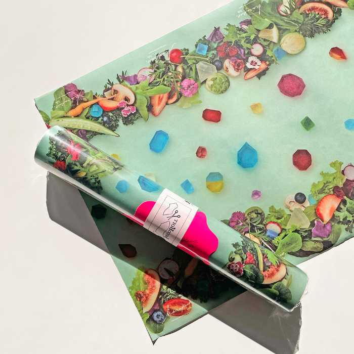 お菓子だけでなく、テーブルを華やかに演出するオリジナルグッズも展開。耐水耐油ペーパー「サラダロードシート」はカラー・ホワイト・ブラックの3色展開で、食卓に直接敷いて使える便利アイテム。