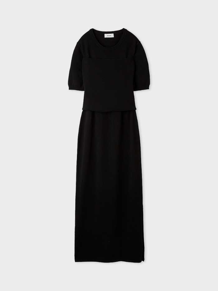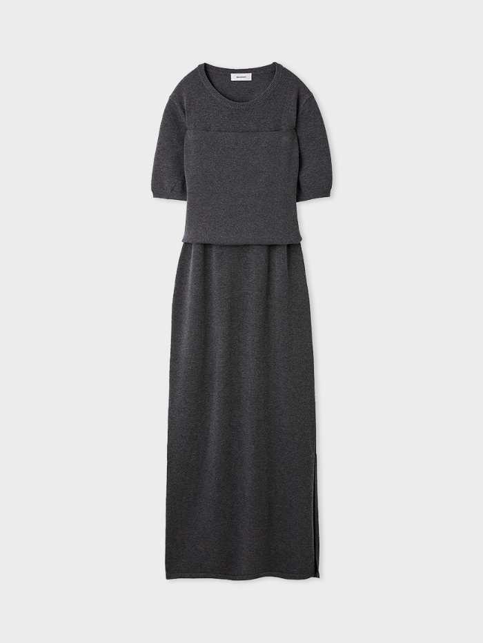 ニットワンピースは、着心地の良さとシーンを選ばない万能さが特徴。シンプルなハイゲージ素材のビスチェがセットになっており、単体でシャツやロンTに合わせても◎。