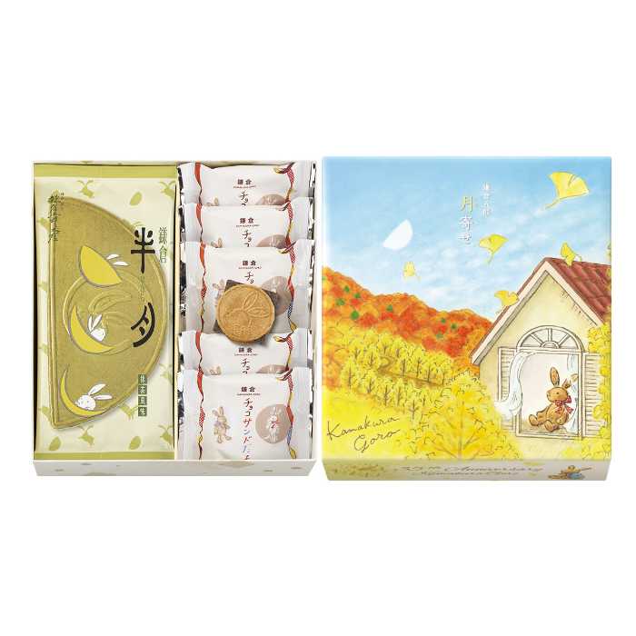 代表作の鎌倉半月(抹茶風味・小倉風味)と鎌倉チョコサンドだょを詰め合わせたセットで、絵本のように可愛らしい秋限定パッケージが魅力です。