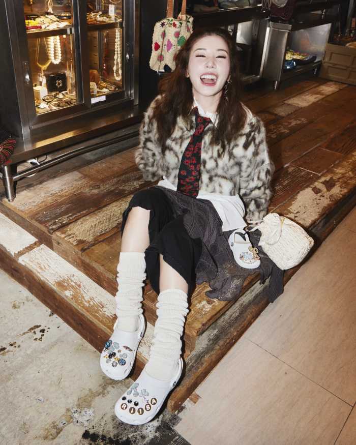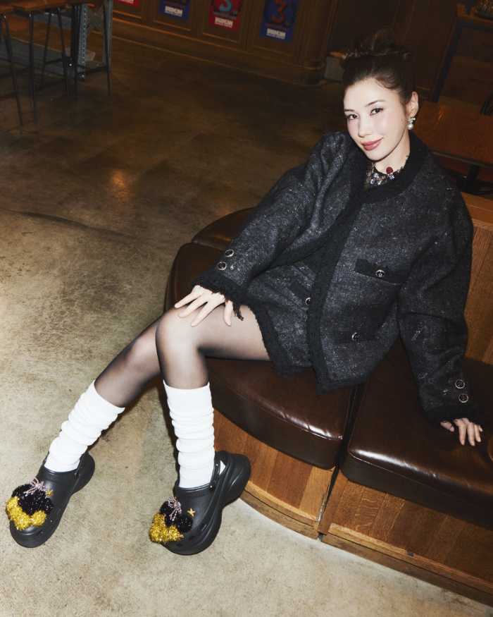 さらにクロッグ型の「クラシック クロッグ ポーチ バッグ チャーム」(1,650円・税込)を取り入れ、遊び心あふれるスタイルを披露。